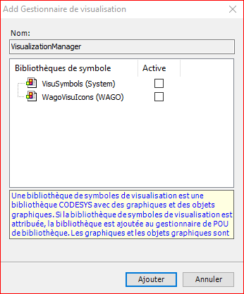 Même si votre projet n'utilise qu'une seule langue, il est vivement conseillé de placer la langue par défaut sur "fr" si vous souhaitez que tous les vos textes soient en français. En effet certaines bibliothèques 3S ou WAGO proposent des visualisations que vous pouvez utiliser directement dans votre projet. Cependant, la langue par défaut de ces visualisations est l'anglais. Si vous voulez que les textes de ces visualisations soient ensuite affichés en français lors de l'exploitation, il faut que la langue par défaut du gestionnaire de visualisations soit sur "fr"