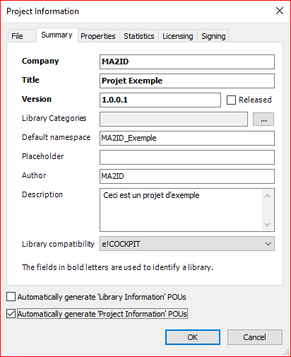 - Cocher la case "Créer automatiquement les POU "Information de projet"